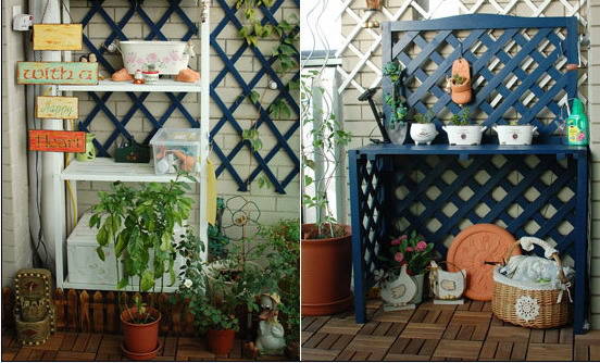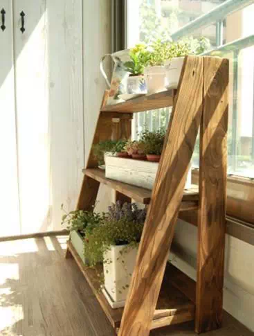 收纳tips:阳台空间不大,所以将数量较多的小花盆摆放在木质收纳搁架上面,这样省空间且不显杂乱。
