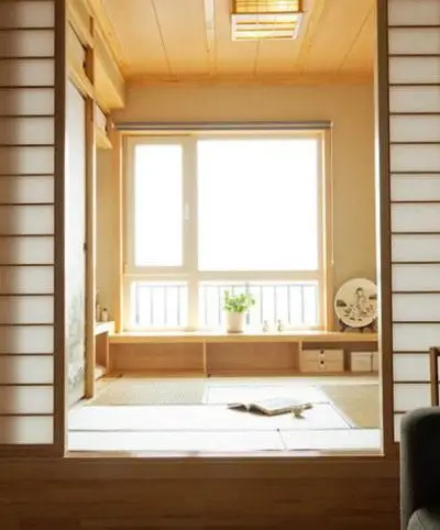 收纳tips:在日式空间的小阳台上,没有什么多余的装饰,简单的一个木质的小桌子贯穿整个小阳台区域,桌板上面,可以摆放上绿色植物,下方则是收纳区,大大增加了阳台的存储空间。