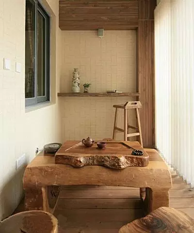 收纳tips:宽敞的阳台全用木质打造,木质的收纳墙、木质座椅、饰品、桌子等,古色古香的木色,让阳台更加贴近大自然,统一的风格也很美观。