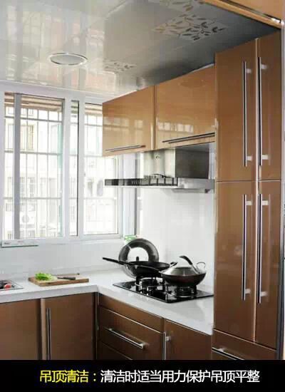 厨房吊顶的清洁:厨房间的扣板大家会选择拉丝或者纳米板,一般都有很好的抗油污性,平时只要用软布来擦拭下即可。但长时间没有清洗的话,吊顶会吸附不少的油渍,这时要用少量的洗洁精,用吸水性较强的软布沾水后去擦洗。