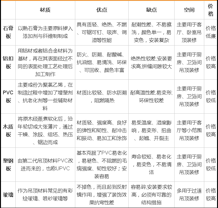 目前主要的吊顶材料主要有石膏板、铝扣板和PVC板这三种,夹板、玻璃等由于自身材质特点,使用较少。业主在选择吊顶装修材料时注意结合材质特点和自己的需求选购。