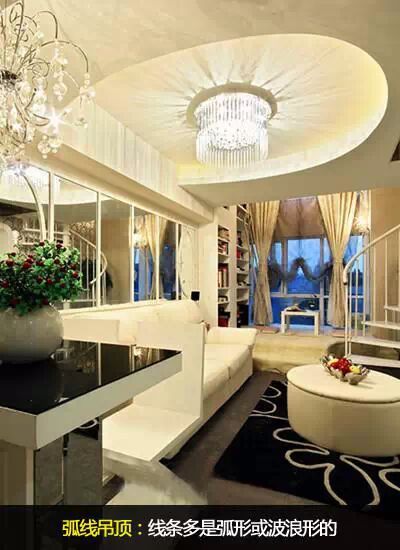 视觉特点:弧线吊顶常要围绕空间走一圈,但线条多是弧形或波浪形的。