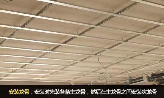 龙骨一般有主龙骨与次龙骨之分。安装时先将各条主龙骨吊起后,在稍高于标高线的位置上临时固定,如果吊顶面积较大,可分成几个部分吊装。然后在主龙骨之间安装次龙骨,也就是横撑龙骨。横撑龙骨截取应使用模规来测量长度。安装时也应用模规来测量龙骨间距。