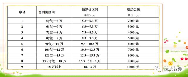 3、签单送:凡在活动期间签单并交不少于30%的首付款,尚派赠送最高价值10000元的“主材家电家具现金券”。