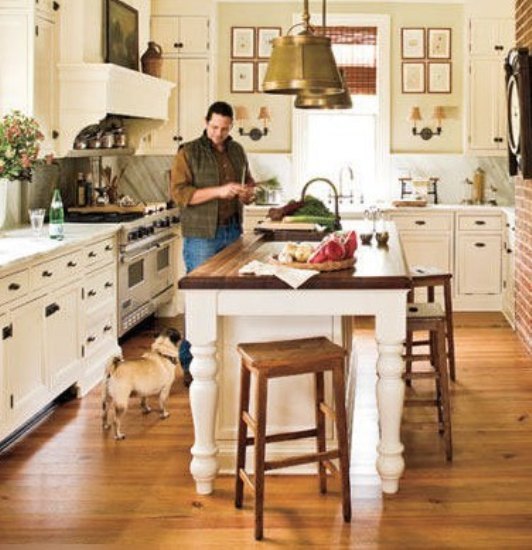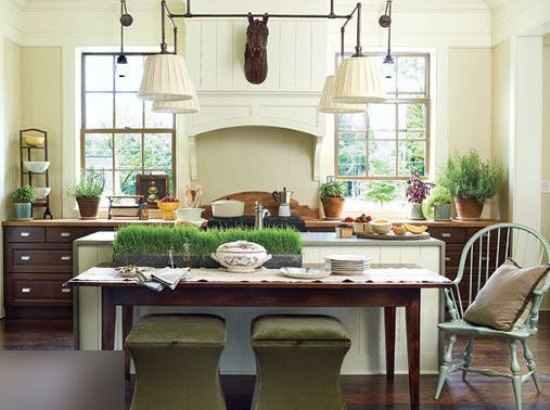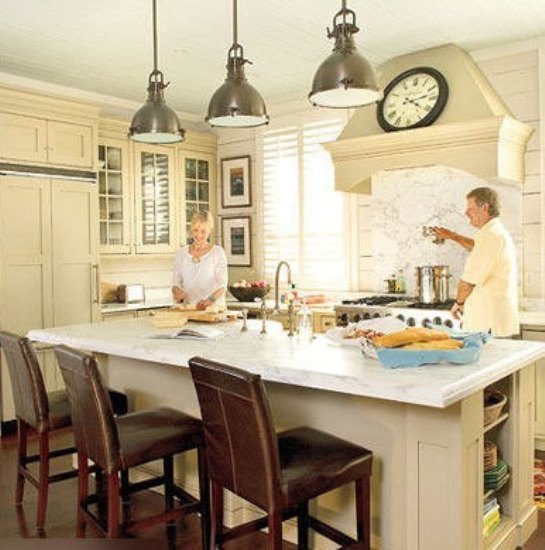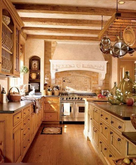 在这样的厨房,就像回到了某个世纪,大量的特色系让房间看起来非常的古色古香。完全开放式的厨房设计让房间看起来显得既大气又华贵,中心岛上面的锅架提供了充足的储存空间,而且本身还是个不错的装饰,厨房配件的个性化使空间更加独特。