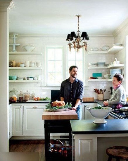 一个吊灯增添了整间厨房的豪华指数,白色的地面瓷砖一路延伸到天花板上,白色开放式置物架放置了各种各样,颜色迥异的餐具,在这样的厨房,做饭也成了一种莫大的兴趣和快乐。