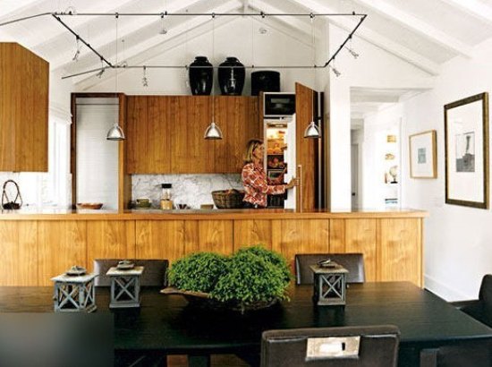 这个厨房是一个平衡了现代与传统的典型例子。拱形的天花板和跟踪照明灯是厨房现代化的重点。餐桌、台面、橱柜甚至冰箱门都运用了多种类型和色调的木材,有醇厚的古典气韵。