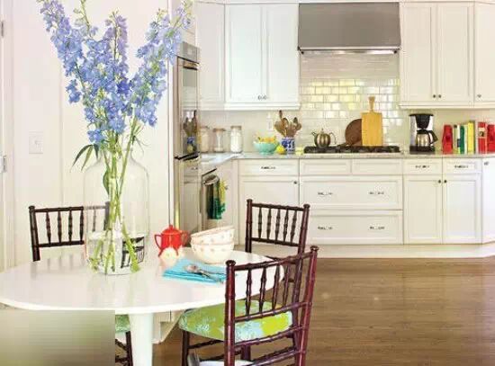 选择在餐区大放异彩,多彩的配件、食谱和毛巾,以及淡淡的紫罗兰都非常漂亮。相对于厨房来看,整体色调较为简单,橱柜和后挡板使用大胆的面料,通体白色的橱柜跟墙面砖,保持厨房的白色调。