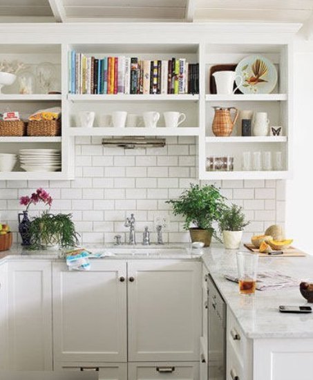 陶瓷瓷砖的墙面非常干净漂亮,配合光滑的大理石台面,光泽明亮。洁白的开放式墙面置物架足够放置各种各样的杂物,如果你想要个私密的空间,橱柜下面还设有好多封闭式收纳柜。