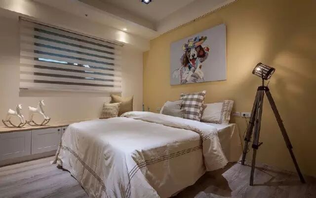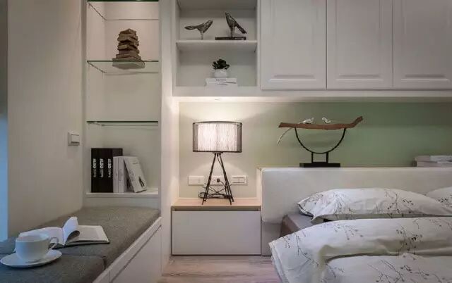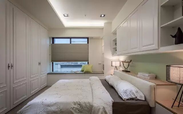 ▶几个卧室的设计都非常简约,基调以白色为主,搭配暖黄色、浅绿色的北京壁纸,为卧室增添升级。在卧室的阳台、床头等地方都设计了很多的柜子和收纳格子,打开床头别致的台灯,读一本最爱的小说,让时光就在此刻静静流淌。