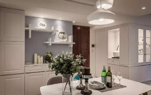 ▶餐厅也用白色作为主色调,既典雅清新又可以弥补采光不足的劣势。浅灰色墙上的收纳设计很别致,既美观又实用。