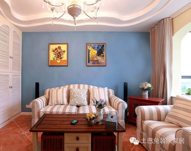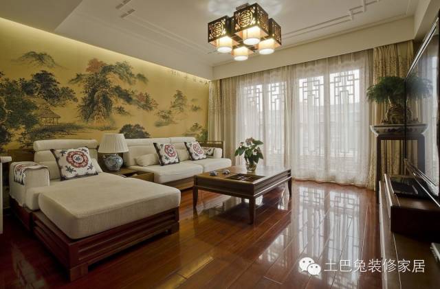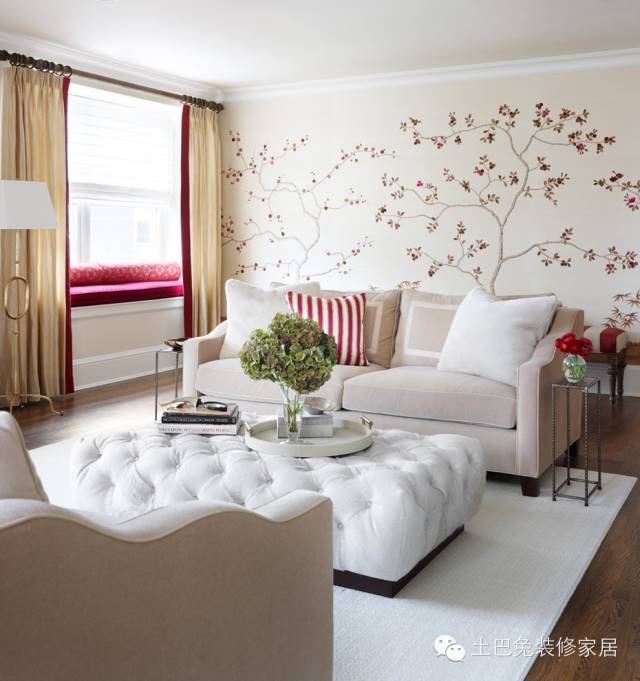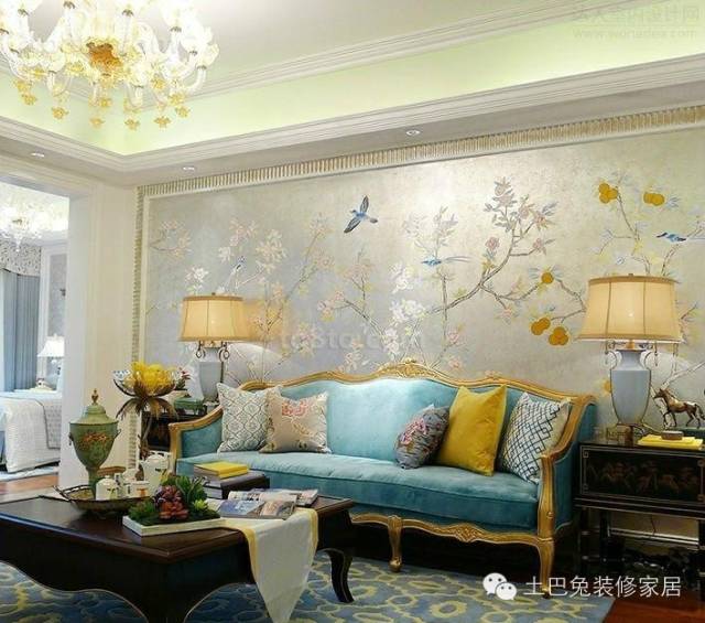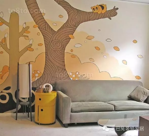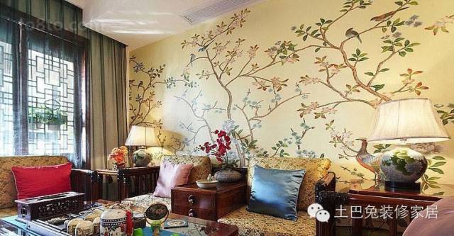 墙饰型的沙发背景墙,直接在原墙面上面贴墙纸或者绘画,整幅墙面纯装饰而没有重点,配上沙发后,显得优雅大方、平和的气势。