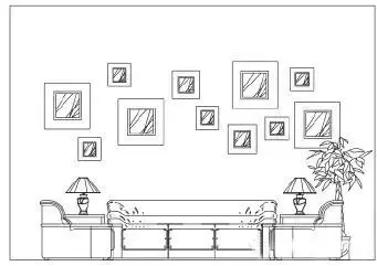 两幅式的挂法一般是两个大小相当于600mmx600mm至1000mmx1000mm大小的装饰画(视墙面面积),大小一致,以沙发的中心为界,在沙发后面分别偏左偏右对称布置。