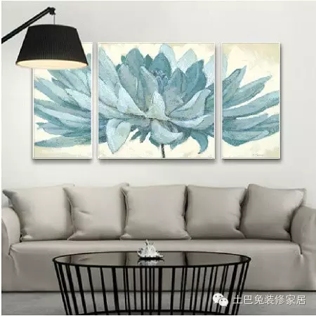 三幅式的挂法一般是三个尺寸一样的装饰画,分开平均布置于沙发后面。