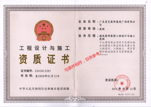 2、一不小心,广东星艺装饰集团广西有限公司取得了“建筑装饰装修工程设计与施工二级资质证书。