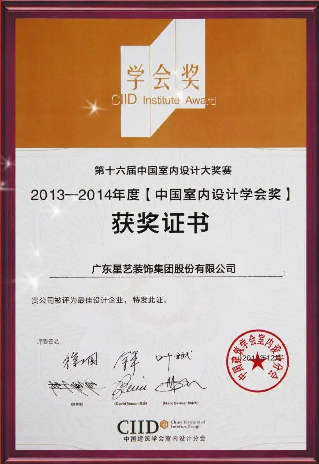 17、一不小心,星艺装饰在CIID第二十三届(哈尔滨)年会暨2013年第十六届中国室内设计大奖赛“学会奖”上,广东星艺装饰集团荣获2013年度中国室内设计学会奖“最佳设计企业奖”。