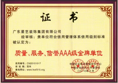 16、一不小心,中国企业信用等级评价中心授予星艺装饰“质量、服务、信誉AAA级金牌单位”。