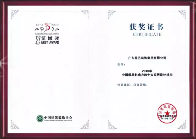 15、一不小心,星艺装饰在中国国际空间环境艺术设计博览会、亚太空间设计师筑巢奖作品展览会及第四届国际艺术和平展上,星艺装饰荣获“2010年亚太优秀设计企业”、“2010年中国最具影响力的十大家居设计机构”两项大奖。