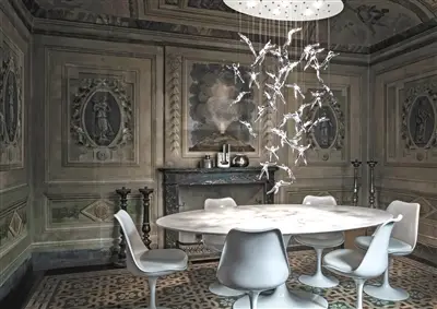 试想一下,从云端跳下来,一道光柱顺着自己向下,是多么刺激的一件事。许多人在见到那些跳伞高手时,心头都会有那么一丝丝的冲动,从高空跳跃的感觉是怎样的?这款灯就带给人一种壮美的感觉,一个个水晶小人都保持着跳跃的姿态,由一根根细细的线牵引着,挂在灯盘上。几道光柱照在这些跳跃的“勇士”身上,真的有一种难以言说的震撼。有这样的灯,即使空间再奢华或简朴,灯一定就是空间的主角。