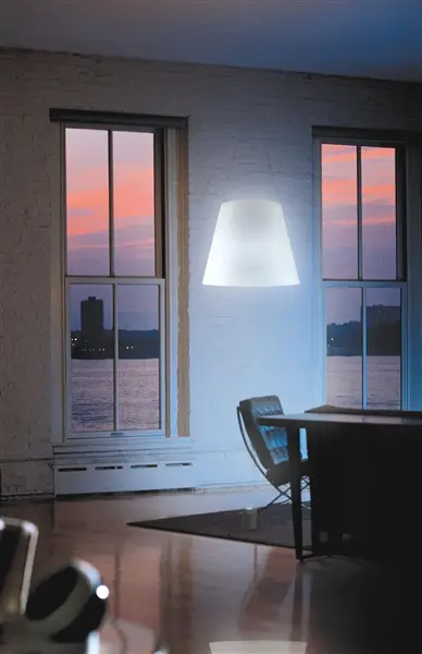 当夜幕渐渐降临,室内空间往往都是瞬间点亮,那种没有“过渡”的光照常常让人不适应。这款FLOS的灯仿佛是天上的月亮,淡淡地散发光芒,柔和的白色照亮了空间。细细的灯绳牵引着灯罩,好像这只灯就是凭空出现在空间里。当晚霞映红天空时,室内柔和的“白月光”亮起,思绪也随着天色平静。