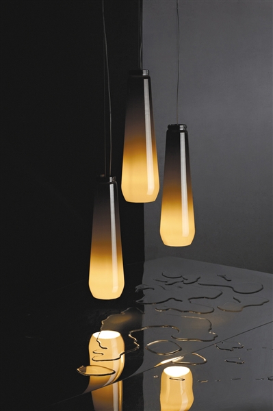 水火难以相容,可光影却是紧紧相随。悬挂的吊灯仿似烛火,而镜面桌面上的水中映着这些光,谁说水火不容?这款吊灯设计简单,但大气十足,灯罩下部是黄色,而上面则是黑色,仿佛是正在燃烧的蜡烛,温和的光在空间里也能成为主角。亮点在于灯罩渐变的色彩,将“火”的燃烧形态很好地表现出来,而镜面桌面则成为光影交融的舞台,让空间立刻就温暖了起来。