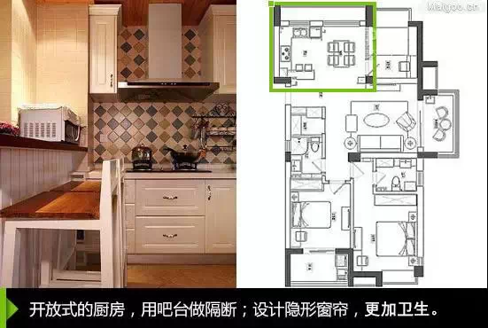 田园风格的厨房,通过彩色小砖、铁艺挂件、白色家具来体现。不过这套案例多了一个亮点:在开放式厨房和餐厅中间,设计了一个窗帘轨道和隐形窗帘,平时做饭时候拉下来,更加卫生。