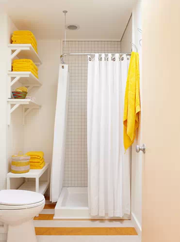小编的话:嫩黄色搭配白色,让整个卫浴间都变的明亮不少。条纹的地面设计有效的增容了空间,扩大了空间的横向面积。墙角的空间完美的划分成了淋浴区,一旁放置的收纳凳以及墙上的收纳柜都很好的将小空间利用了起来。