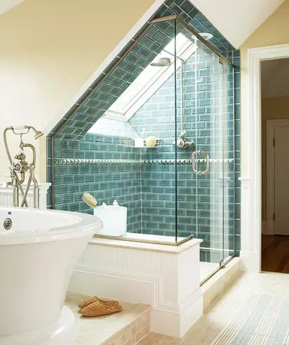 小编的话:把阁楼改造成功能齐全的小卫浴间,如何利用斜坡顶是关键,此款案例,根据坡顶的走势进行设计,镶入了大小适合的天窗,加上斜坡上的造型,温馨而典雅。淋浴房内的绿色竹纹路墙面瓷砖,为整体增添几分田园风味。浴缸地面采用了地台,能很好的保证空间的干湿分离。