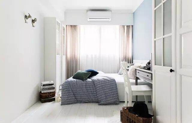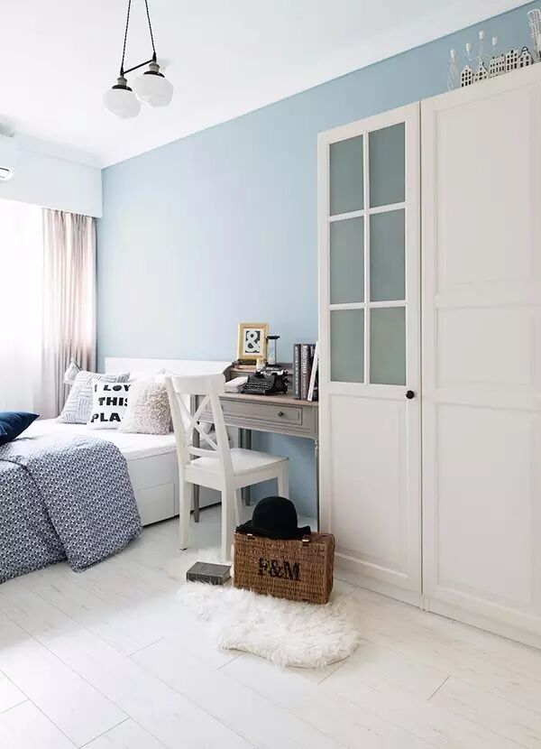 小女儿的卧室,明亮的蓝色涂料墙面奠定空间活泼优雅的调性,白色木地板加深了空间柔和的感觉。
