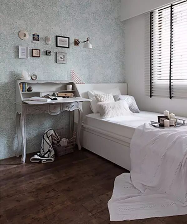 大女儿的房间,是三间卧室里最小的。墙纸同样是蓝色系,不过处理手法有所区别。采用带纹理的壁纸,加上百叶窗,不是太好的光线条件反而空间带来了复古欧式的风味。