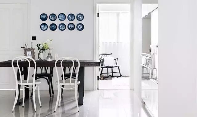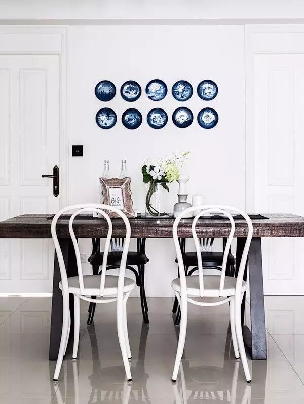 屋主珍藏的哥本哈根盘挂在餐厅墙面上作装饰,和空间整体很搭。