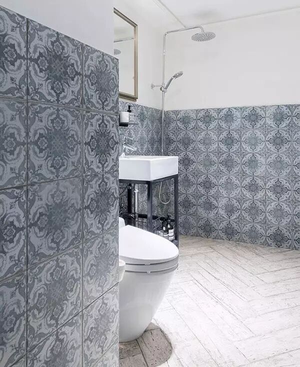 卫生间。花砖的灰蓝色调和餐厅墙壁的碟盘藏品相近,整体搭配了全屋的设计。
