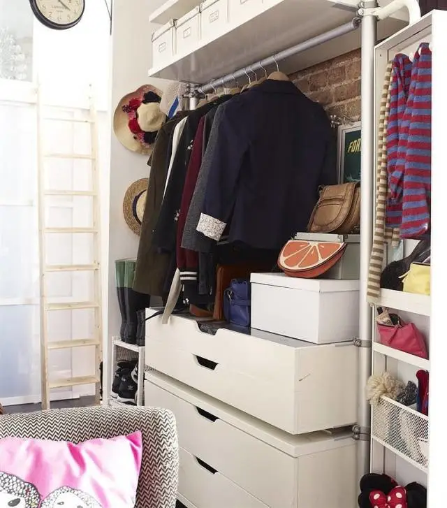这套储物单元一般是放在卧室的,但Eleonore却用到了客厅,因为是白色的,所以符合公寓的基础色,与裸露的砖墙搭配,这个平常看来一点特色都没有的开放式衣橱竟成了装饰,外套、手套、帽子、手袋、配饰,还有放不上长梯鞋架的鞋子,以及家里其他杂七八糟的东西都可以放在这里。