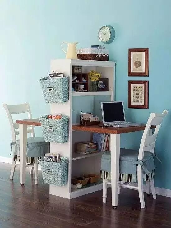 陈设柜一般不好利用,不妨在两侧各放一个小书桌,柜面旁挂上几个储物篮,减少了物品的存放麻烦。