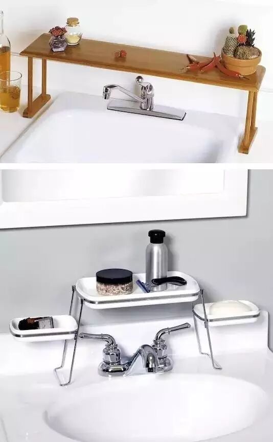 谁说水池开关旁边就不能放东西?淘个小桌子放上去,洗漱台都能整洁多了。厨房水池旁可照做~