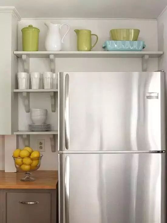 有些柜子较高,那些多余空间放着干嘛,挂几个储物篮吧,既隐秘又美观。对了,还有冰箱上方,这个位置一定被遗忘太久了,快快用起来!