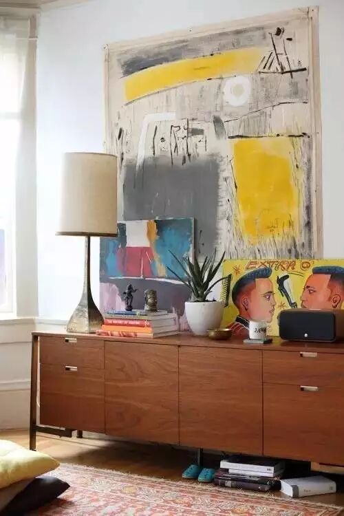 艺术品装饰墙壁,色彩的搭配减少白色墙体给人造成的压抑。
