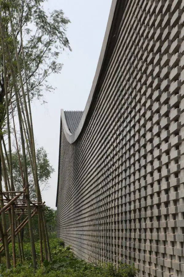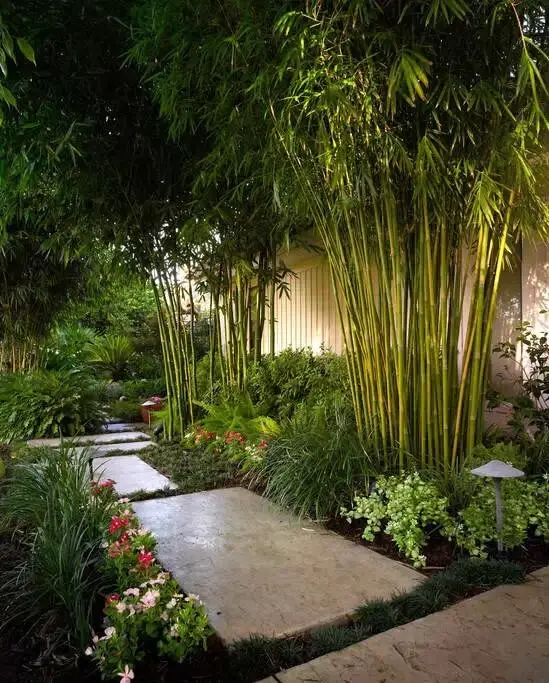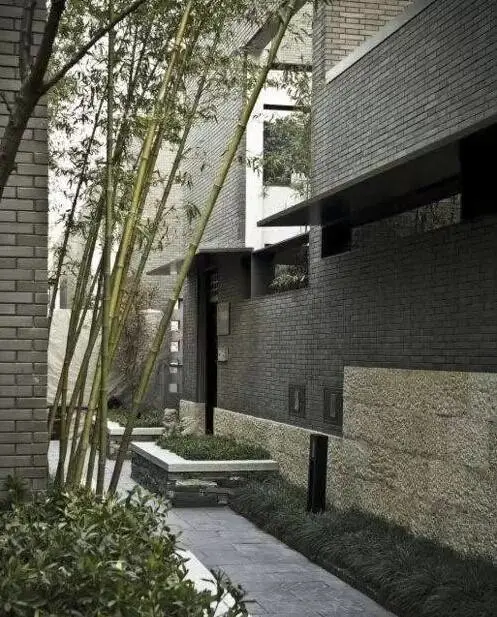 选择较低矮的竹类,如观音竹,在屋基、墙角种植,以其独特的形态与质地柔化建筑物的生硬线条,使得空间显得和谐而有生气。