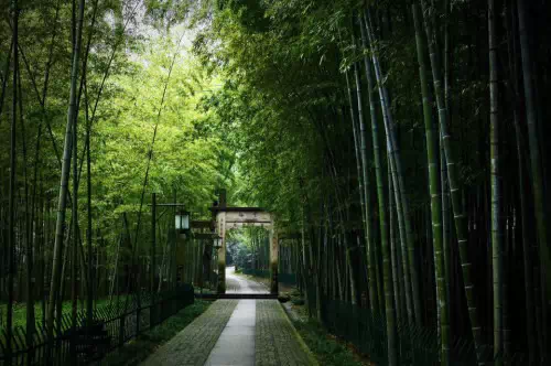 以大面积竹林面植或线植、带状的列植,可使公共开放空间中的景致和谐划一,如公园绿地、人行步道的街景,不仅有掩饰作用,又有统一的效果。