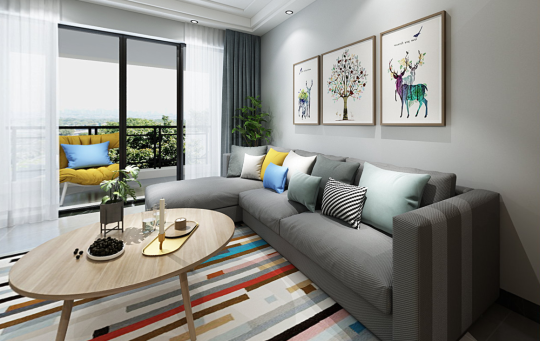 ∆客厅的布置处处凸显现代简约感,色调整体偏灰白,灰色布质沙发柔软舒适,地毯、挂画、抱枕都有少量彩色,搭配和谐,增添了不少时尚感。