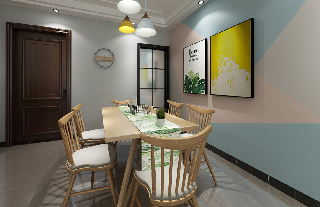 ∆餐厅整体简洁又富有格调,可同时容纳6人的长方形餐桌,带着柔软布质坐垫的木质餐椅,保证就餐过程的舒适,也与整个空间的搭配风格协调一致。