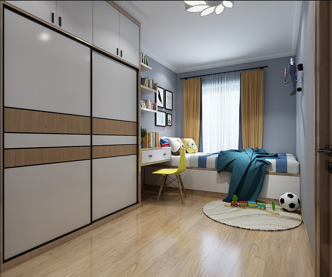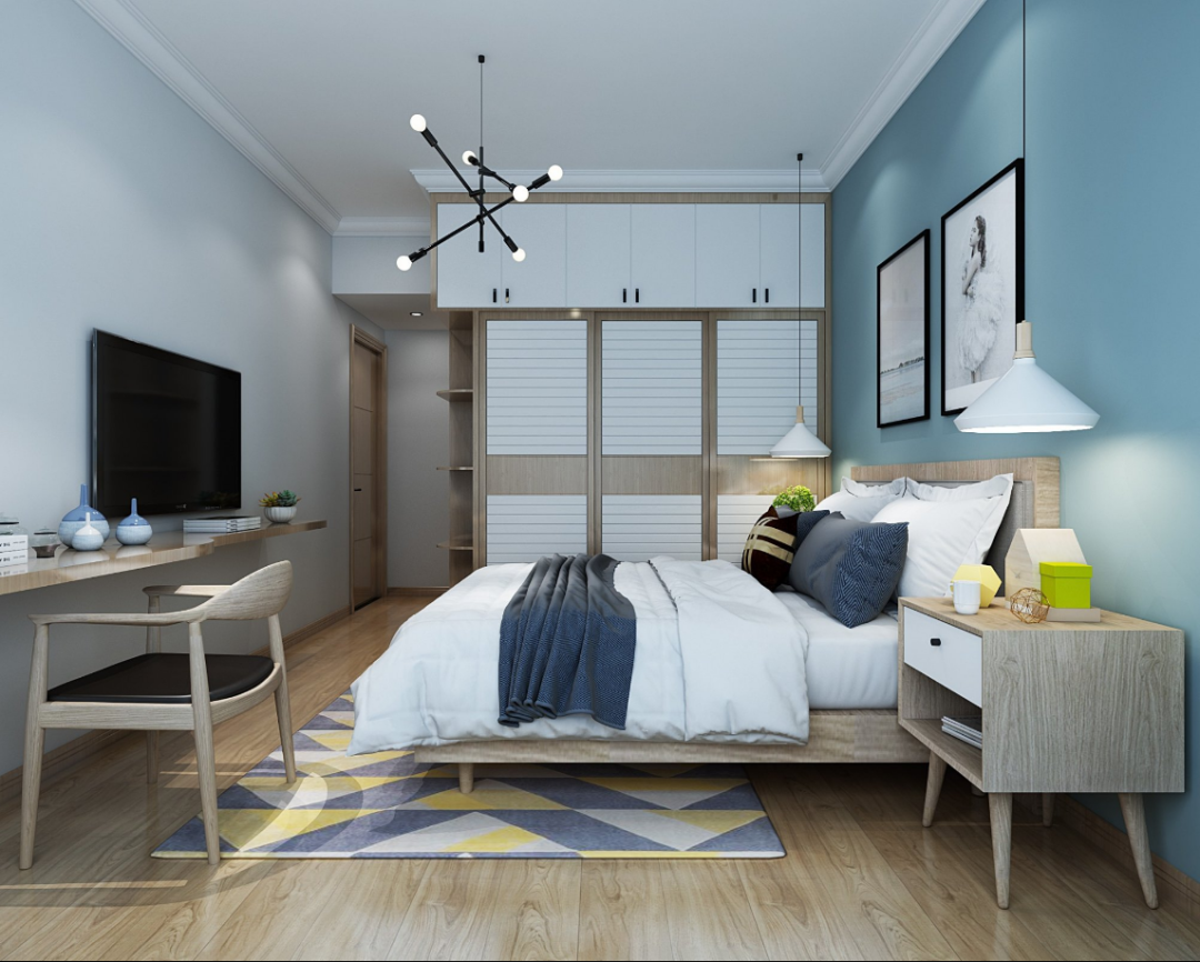 ∆主卧和客厅的风格一样,墙面还是刷硅藻泥,一面浅蓝,一面中蓝,搭配地面原木色木纹砖,更显温馨舒适。衣柜与床头柜都是原木色与白色组合,保持空间协调的一致性。