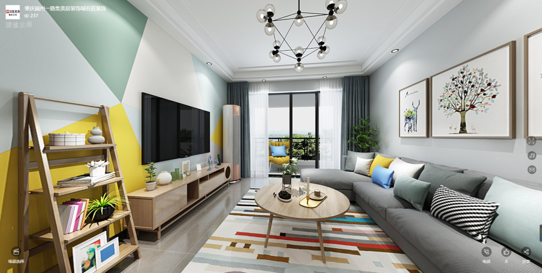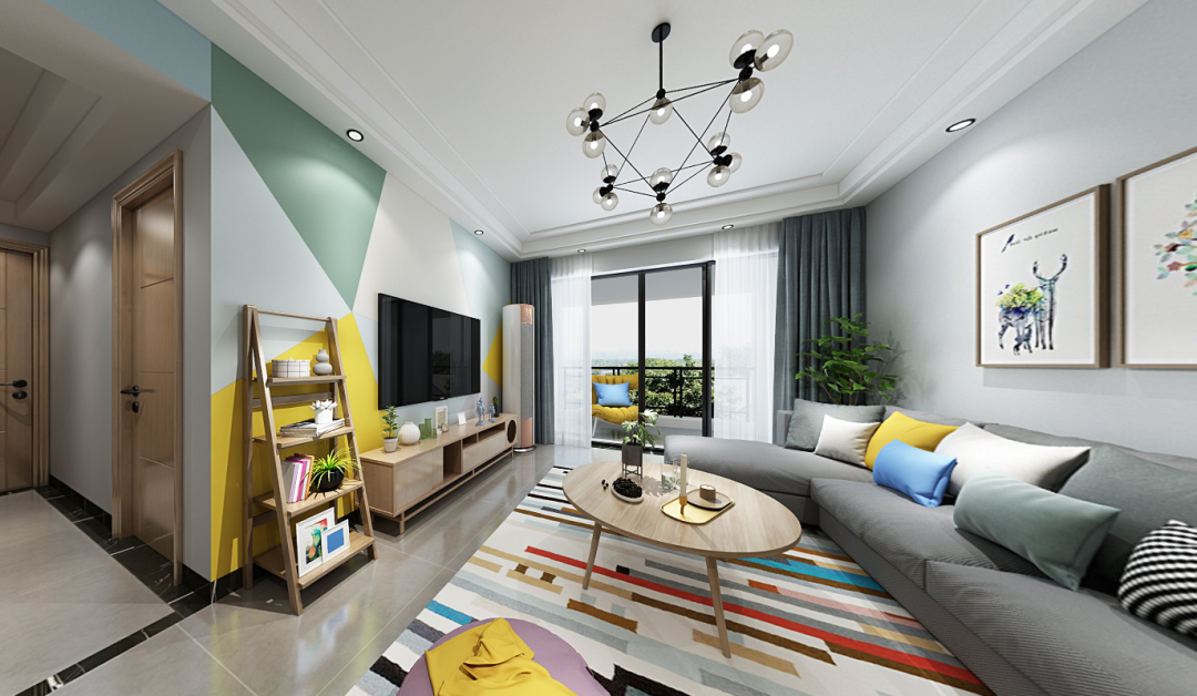 ∆简单的电视背景墙,墙面刷硅藻泥,由几个不同颜色、不同形状的多边形图案组成,尽显现代风格,仿佛有一阵时尚风扑面而来。旁边放置多层木架,与电视柜一起用于收纳生活小物件。