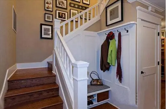 转角楼梯与楼梯间当中无形中留下了一个不大不小的空间,那就给楼梯增加便捷所用,装上可以收纳的座椅收纳鞋子,上方放上软靠垫促成座椅,一侧的挂钩设计又能为更换衣物寻得容身之所。