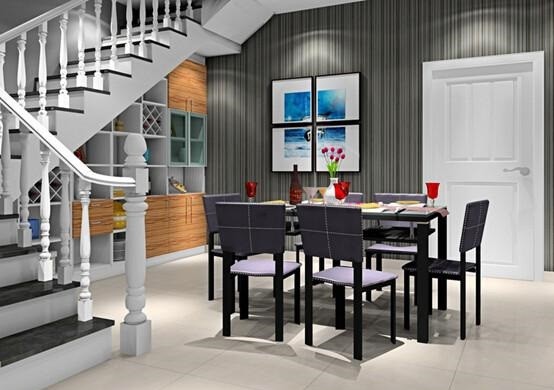楼梯间有较深的空间,将其定制成一个容量较大的收纳空间,并不是什么难事,可以改造成了一个具有多隔层的收纳碗橱柜,正巧处于餐桌旁,带去了不少便捷。