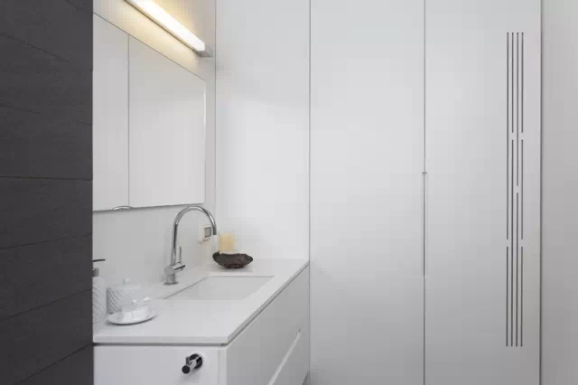 浴室是扩展到一个浴缸和一个大衣橱巧妙地隐藏了洗衣机和烘干机。