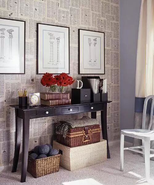 桌子下方空余处堆放的复古风格收纳箱在带来美感的同时还有不小的实用价值。