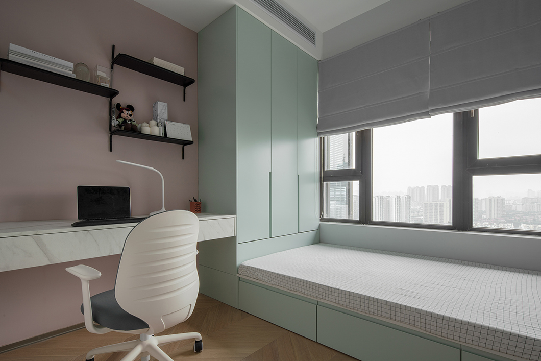 儿童房空间较小,布局方式和客房一样,榻榻米靠窗放置,留出卧室足够多的活动空间。