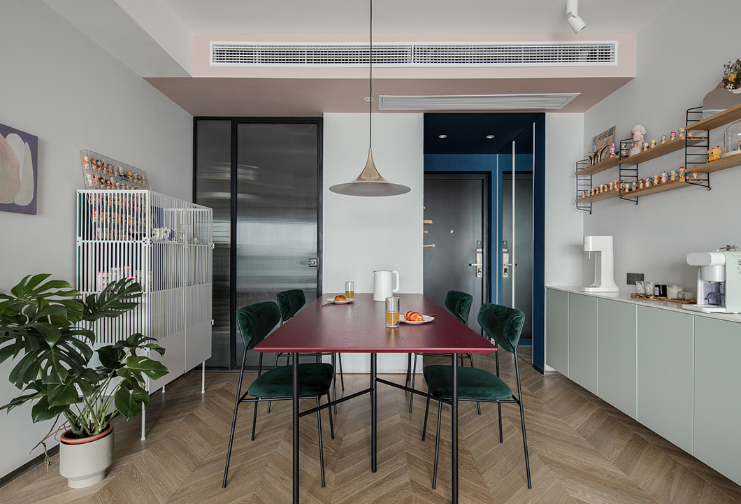 整个客餐厅墙面刷低饱和度浅灰色墙漆,电视背景墙刷天鹅绒艺术漆,地面铺屋主喜欢的人字拼木地板,增加空间材质的层次感。