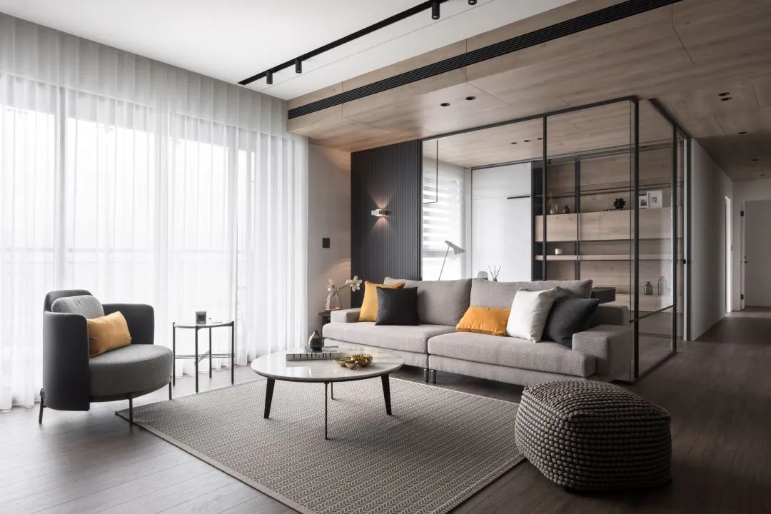 书房以玻璃隔断与客厅之间分开,呈现出一种通透而又实用的空间氛围,让在家工作加班也更加轻松自然。